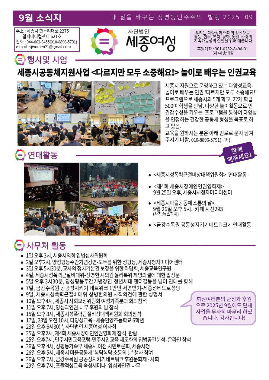 2025년 9월 사단법인 세종여성 활동소식입니다.